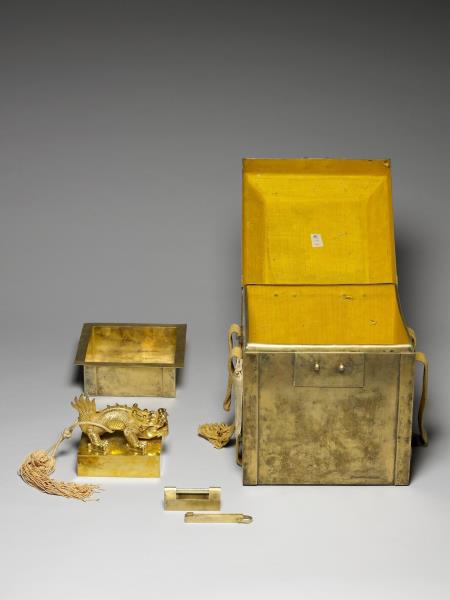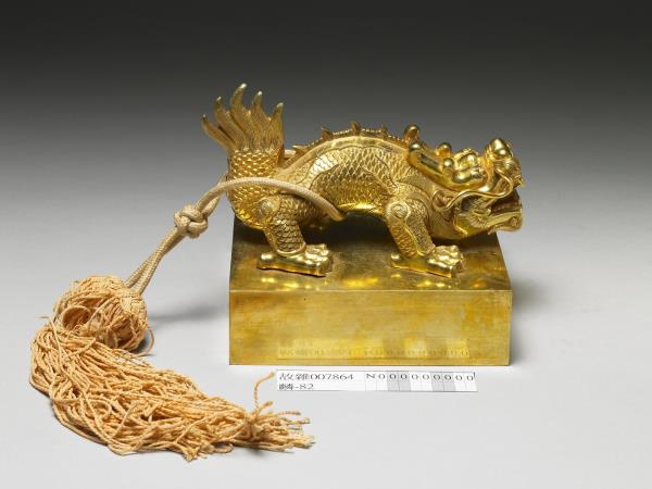 | 說明 | 銅鍍金製方形印璽,印鈕作龍紋,繫黃?,印身周邊光素,印面雕篆書及滿文:「榮惠皇貴妃之寶」。帶銅鍍金盝頂印匣,內有一銅托,另附一鎖、一黃袱,二錦墊。榮惠皇貴妃為清穆宗同治皇帝的?嬪,西林覺羅氏,同治十一年初封?貴人,十三年進為嬪,光緒二十一年間晉封為妃,三十四年尊封為皇考?貴妃。遜國後,民國二年,加封為榮惠皇貴妃;十一年溥儀婚後稱為太妃,民國十三年溥儀出宮後不久,於十一月二十一日出宮,移居榮壽固倫公主(恭親王奕訢長女)家。 |