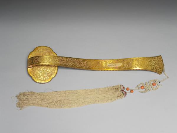 | 說明 | 通體皆加紋飾:正面為斜卍字地紋,邊側為連續回紋,背面為盤枝番蓮嵌雕八寶。正面首部中央鑲一橢圓形紅色碧璽,周圍繞以珍珠十五顆,及碧璽小圓珠九顆。珊瑚蝙蝠五,下方鑲一珊瑚壽字。柄面鑲八仙所持標誌物,自上而下玉扇(漢鐘離)玉笛(韓湘子)、碧璽葫蘆(李鐵拐)、松石漁鼓(張果老)、碧璽雙板(曹國舅)、松石劍(呂洞賓)玉花籃(藍采和)、玉花(何仙子)。尾鑲珍珠六顆及紅碧璽兩顆。下垂土黃壽字編花雙穗。 |