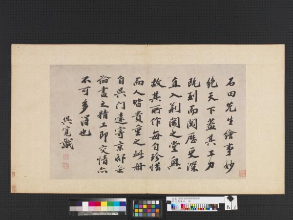 石田先生繪事。妙絕天下。蓋其工力既到。而閱歷更深。直入荊關之堂奧。故其所作。每自珍惜。而人皆貴重之。此冊自吳門遠寄京邸。無論畫之精工。即交情亦不可多得也。吳寬識。 |
