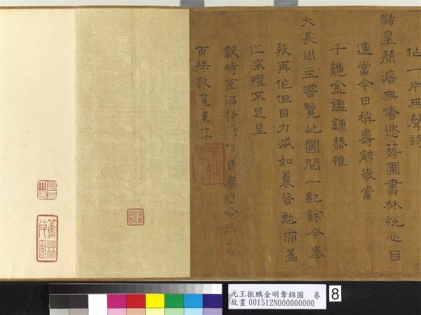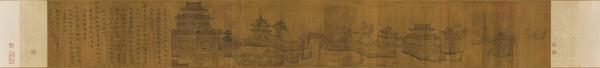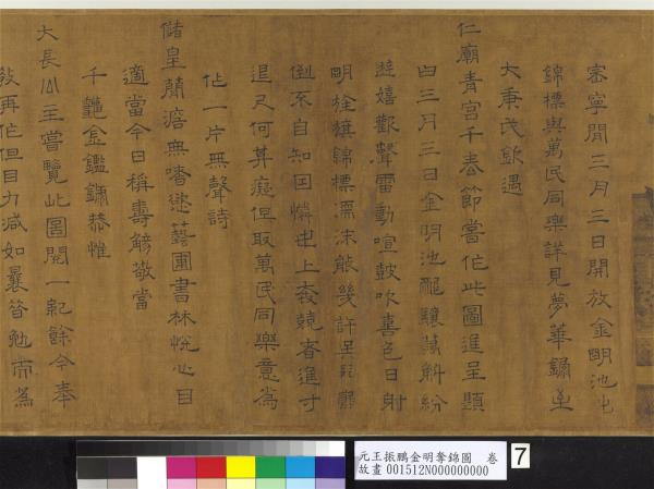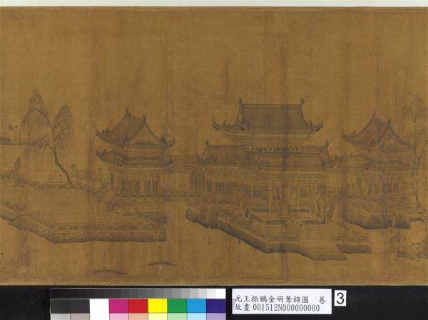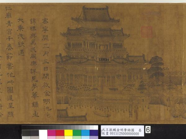 崇寧間三月三日。開放金明池。出錦標與萬民同樂。詳見夢華錄。至大庚戌。欽遇仁廟青宮千春節。嘗作此圖進呈。題曰。三月三日金明池。龍驤萬斛紛遊嬉。歡聲雷動喧鼓吹。喜色日射明旌旗。錦標濡沫能幾許。吳兒顛倒不自知。因憐世上奔競者。進寸退尺何其癡。但取萬民同樂意。為作一片無聲詩。儲皇簡澹無嗜慾。藝圃書林悅心目。適當今日稱壽觴。敬當千秋金鑑錄。恭惟大長公主嘗覽此圖。閱一紀餘。今奉教再作。但目力減如曩昔。勉而為之。深懼不足呈獻。時至治癸亥(西元一三二三年)秋莫。廩給令王振鵬百拜敬畫謹摹。(字缺)。 |
