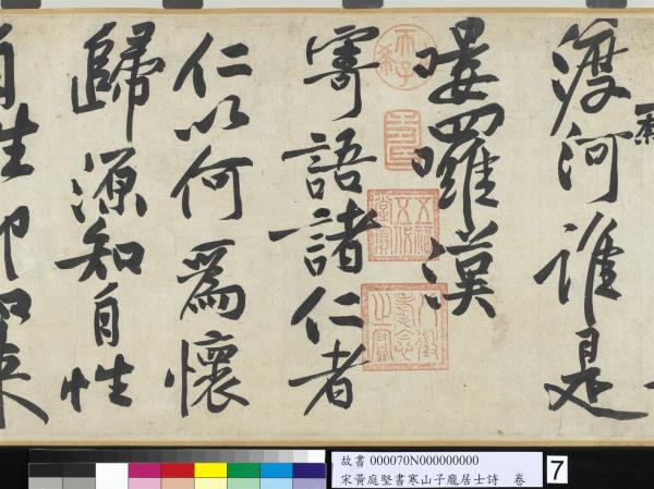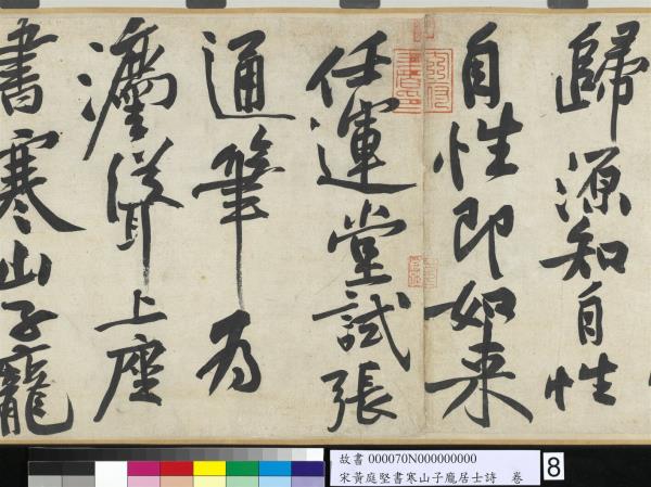 元符二年至三年間(1099-1100),黃庭堅謫居戎州(四川宜賓),於齋館「任運堂」試筆,書唐代僧人寒山子與龐居士詩作,然寒山子詩第三首後半與龐居士詩已佚失。此卷墨色腴潤飽滿,筆法控馭自如,反映參禪修行對他生活及創作的深刻影響,為晚年重要的大字行書。黃庭堅(1045-1105)字魯直,號涪翁、山谷道人,江西分寧人。他擅長於詩文、書法,和蘇軾、米芾、蔡襄並列為北宋四大書家。(20110913)
