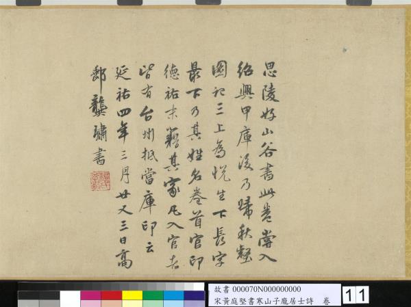 黃庭堅(1045-1105),字魯直,號山谷道人。善詩文、長書法,為「宋四大家」之一。此卷書唐代禪僧寒山子詩二首半,為黃氏貶謫至戎州時(1099-1100)所作。