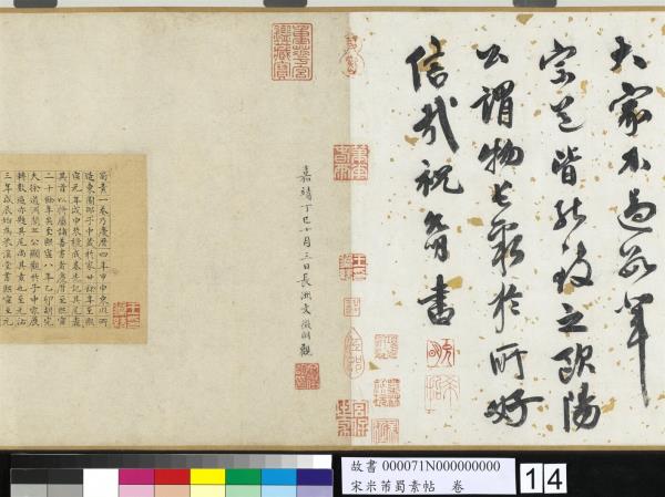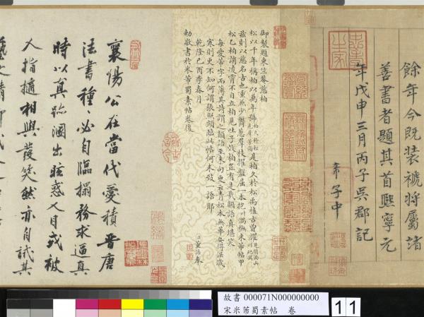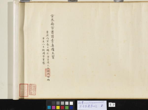 題跋 高士奇 印記 expand_more 拖尾 宋米南宮書蜀素真蹟至寶。康熙丙寅春日。購於海昌陳氏。白金伍伯兩。辛未八月。朗潤堂重裝。