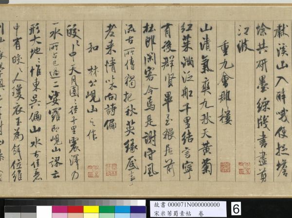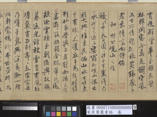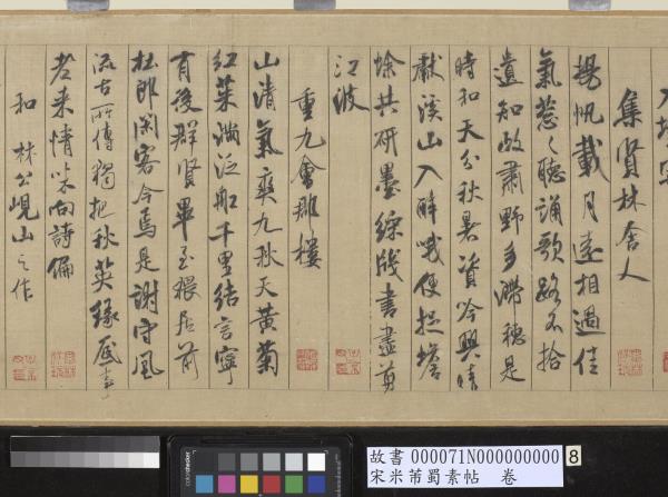 Description In the autumn of 1088, Mi Fu received an invitation from Lin Xi (fl. 2nd half of 11th c.), an official in Huzhou (modern Wuxing, Zhejiang), to write on a piece of precious “Sichuan silk” that had been in Lin’s collection for many years. Mi Fu consented, composing and calligraphing eight poems in various formats. Although the calligraphy was done within the confines of a grid of black silk threads woven into the handscroll silk, the brush gallops and darts in a variety of forms and with an expression of animated spirit, not being confined in the least by any restrictions. As Mi Fu was shedding influences of the ancients, this work can be viewed as an important milestone in the formation of his own calligraphic style. Mi Fu, a native of Xiangyang (modern Xiangfan, Hubei), was a poet, painter, and calligrapher with an important collection of art. He excelled at connoisseurship and became known along with Cai Xiang, Su Shi, and Huang Tingjian as one of the Four Masters of Northern Song calligraphy. (20110913)
