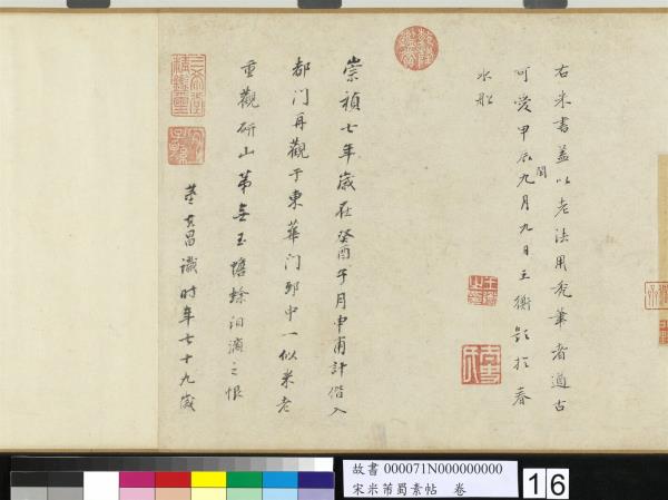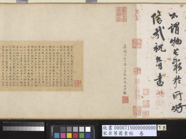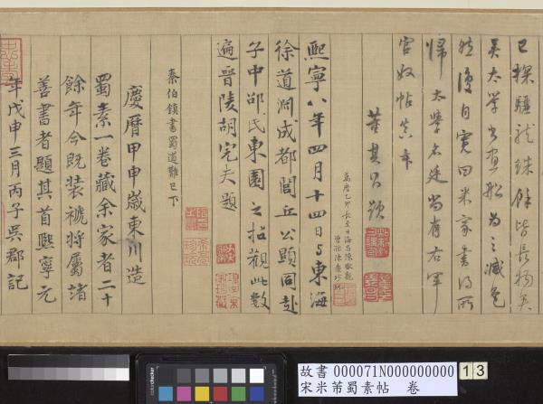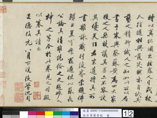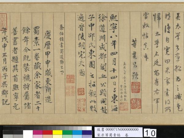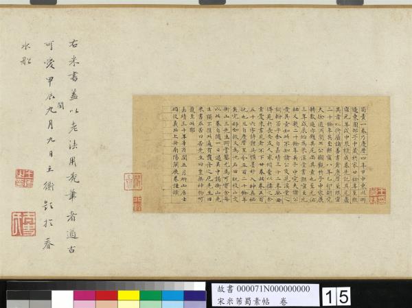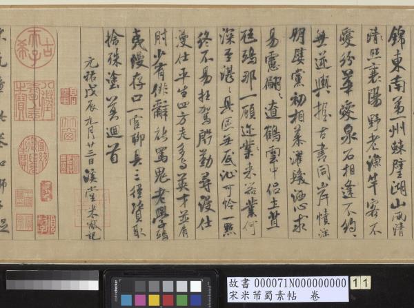 題跋 顧從義 拖尾 嘉靖三十年辛酉閏五月。研山居士顧從義。北上舟南陽閘展卷謹識。 楷書 蜀素一卷。乃慶曆四年甲申東川所造。東園邵子中藏於家廿餘年。至熙寧元年戊申裝褫成卷。先記其尾。虛其首。以將屬諸善書者。慶曆至熙寧。二十餘年矣。至熙寧八年乙卯。胡完夫。徐道淵。閭丘公顯。觀於子中家。展轉數遍。亦題其尾。尚其素也。至元祐三年戊辰始為米溪堂書。熙寧至元祐。又幾二十餘年矣。子中。完夫諸公愛其素如此。不知諸公及見溪堂之詞翰否乎。余自嘉靖三十二年癸丑。得見於長安友人家。傾囊以搆之。余素愛米書。見者不下廿卷。此卷五百五十六字。詩體具備。墨妙入神。真祕玩也。且自慶曆至今。五百二十餘年矣。完好如故。又為沈石田。祝枝山。文衡山三先生所賞鑒。尤為可寶。余每以此卷自隨。一日過吳中。謁衡山先生。獨不攜此。適有覆舟之厄。先生曰。米書在否。曰否。先生曰。豈無神物呵護至此耶。嘉靖三十年辛酉閏五月。研山居士顧從義。北上舟南陽閘。展卷謹識。