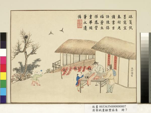 硃箋試墨寫宜春。村老傭書吉語陳。錫福蒼生揮鳳管。重華開筆永遵循。 |