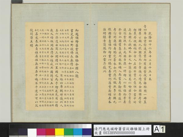 乾隆四十六年十二月十五日。奉旨四庫全書進呈。書內有蕭雲從畫離騷圖一冊。蓋踵李公麟九歌圖意。而分章摘句。續為全圖。博考前經。義存規鑑。頗合古人左圖右書之意。但今書中所存各圖。已缺略不全。又如蓀荃蘭蕙。以喻君子。寄意遙深。雲從本未為圖。自應一併繪入。以彰稱物芳。著於古今圖書集成內採取補入。南書房翰林等逐一考訂。將應補者酌定藁本。令門應兆倣照李公麟九歌圖筆意補行繪畫。以臻完善。書仍舊貫。新補者各注明。錄旨簡端。即以當序。欽此。