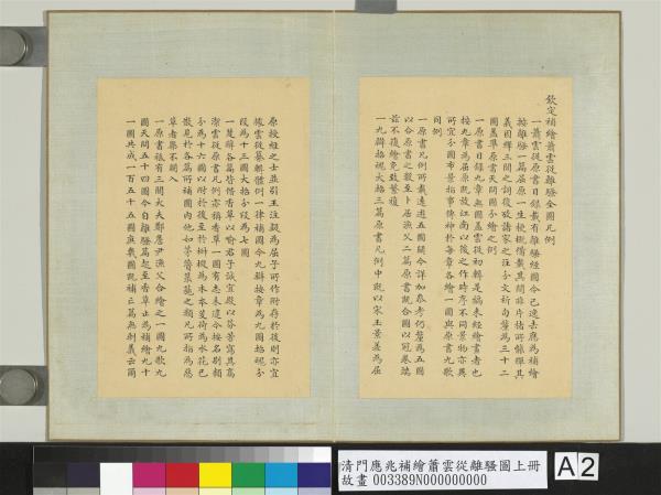 欽定補繪蕭雲從離騷全圖凡例。一蕭雲從原書目錄。載有離騷經圖。今已逸去。應為補繪。按離騷一篇。屈原一生梗概。備載其間。非片楮所能殫其義。因繹三閭之詞。復考諸家之注。分文析句。釐為三十二圖。蓋準原書天問圖分繪之例。一原書目錄。九章無圖。蓋雲從初輯是編。未經繪畫者也。按九章為屈原既放江南以後之作。時序不同。景物亦異。所宜分圖布景。指事傳神。於每章各繪一圖。與原書九歌同例。一原書凡例所載遠遊五圖闕。今詳加參考。仍釐為五圖。以合原書之數。至卜居漁父二篇。原書既合圖以冠卷端。茲不復繪。免致繁複。一九辯招魂大招三篇。原書凡例中。既以宋玉景差為屈原授經之士。並引王注疑為屈子所作。附存於後。則亦宜據雲從纂輯體例。一律補圖。今九辯按章為九圖。招魂分段為十三圖。大招分段為七圖。一楚詞各篇。皆借香草以喻君子。誠宜殿以芬芳。寫其高潔。雲從原書凡例。亦稱香草一圖。有志未逮。今按名別類。分為十六圖。以附於後。至於椒樧為木本。芰荷為水花。已散見於各篇所補圖內。他如茅薋菉葹之類。凡所指為惡草者。概不闌入。一原書祇有三閭大夫。鄭詹尹。漁父。合繪之一圖。九歌九圖。天問五十四圖。今自離騷篇起。至香草止。為補繪九十一圖。共成一百五十五圖。庶幾圖既補亡。篇無剩義云爾。