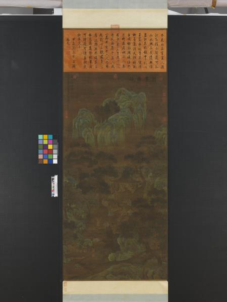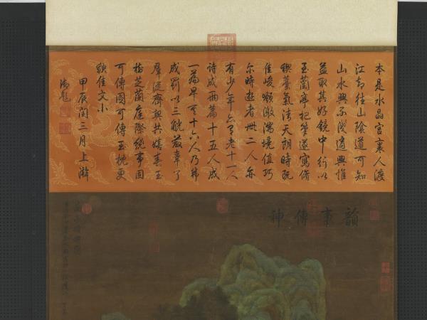 本是水晶宮裡人。渡江却往山陰道。可知山水興不淺。適興惟益取其好。鏡中行以至蘭亭。把筆遂寫脩禊藁。氣清天朗時既佳。峻嶺激湍境值巧。爾時遊者卌二人。亦有少年亦有老。十一人詩成兩篇。十五人成一篇早。其十六人乃弗成。罰以三觥蔽辜了。群從齊契共嬉春。玉樹芝蘭庭際繞。事固可傳圖可傳。玉枕更貌佳文小。甲辰(西元一七八四年)閏三月上澣御題。 |