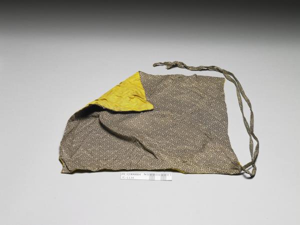 四方形,褐底白色卍字不斷錦卷為表,黃色緞布為裡,一角縫有對折繫帶。